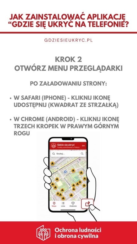 „Gdzie się ukryć” to nowoczesne i przyjazne narzędzie, które może posiadać każdy obywatel. Zostało zaprojektowana z myślą o prostocie i skuteczności: wystarczy telefon komórkowy typu smartfon by w sytuacji nagłego zagrożenia – np. bardzo silnego wiatru czy potencjalnych zagrożenie środkami napadu powietrznego – szybko odnaleźć najbliższe Punkty Schronienia (PS) oraz uruchomić nawigację na mapie. Co ważne, po wcześniejszym pobraniu danych aplikacja działa również w trybie offline.